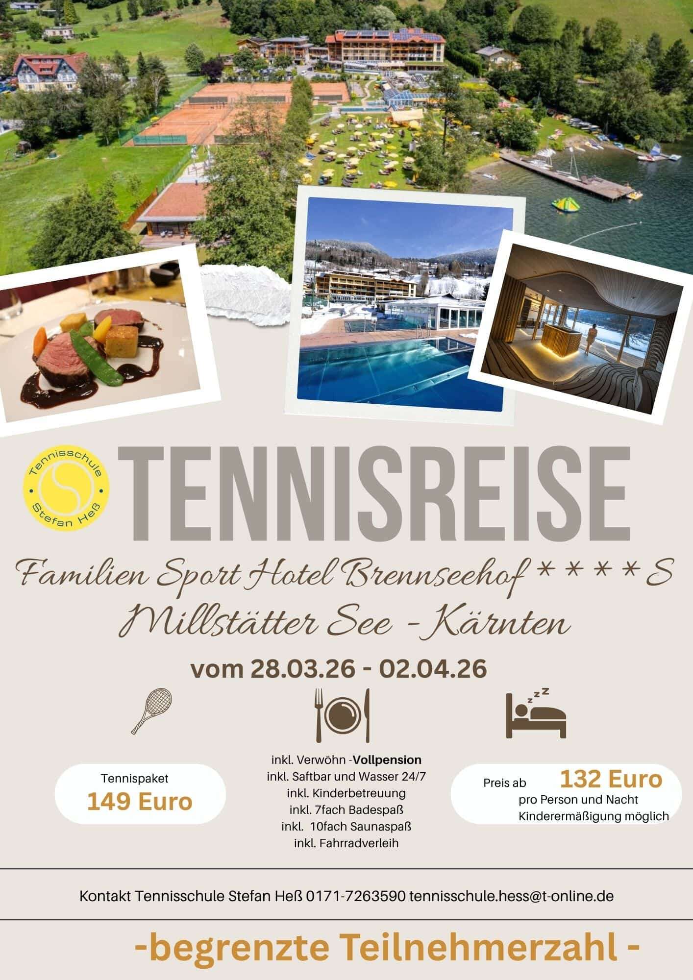 Die Tennisschule Heß bietet seit einigen Jahren Tennisreisen zur Saisonvorbereitung während der Osterferien an. Auch für 2026 konnte wieder ein größeres Kontingent in einem Top Hotel gesichert werden. Für alle, welche die Familie mitnehmen wollen, bietet das Hotel viele Möglichkeiten für Jung und Alt. Alle Infos dazu, findet ihr in den beigefügten Flyern.