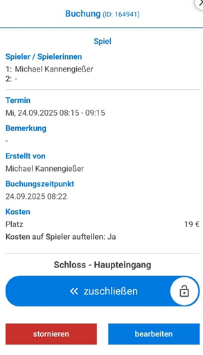 - Wir sind gerade noch dabei die letzten Arbeiten für das Zugangssystem abzuschließen. Zukünftig wird der Zutritt zur Halle nach Buchung über die Haupteingangstüre erfolgen. Hier ist ein neuer Schließzylinder installiert worden. Mit der Buchung des Hallenplatzes erhält man über die App auch die Berechtigung den Schließzylinder zu öffnen. Die Berechtigung kann über „Meine Buchungen“ oder den Buchungsplan aufgerufen werden. Dabei einfach die Buchung aufrufen und das Feld „aufschließen / zuschließen“ betätigen. Einen Beispiel haben wir nachfolgend beigefügt. Das Schloss ist 30 Minuten vor und 60 Minuten nach dem Buchungszeitraum verfügbar.